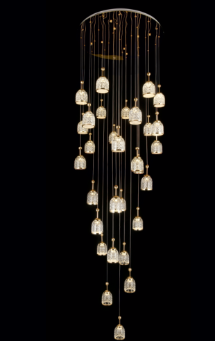 Hanging Light features a LED holder type with a size of C 800 x H 4000(MM). Made from high-quality Aluminum + Acrylic, it comes with a beautiful Gold finish.